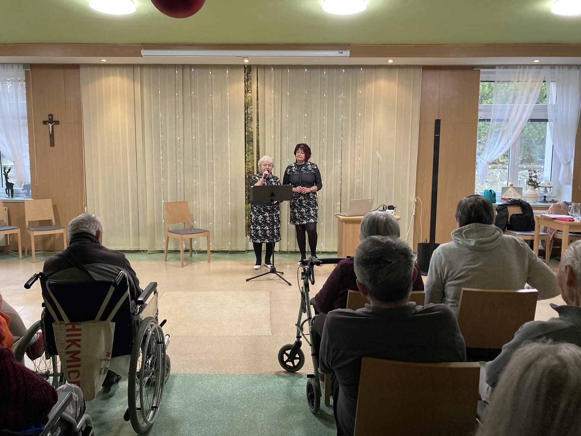 Ve středu 17. prosince jsme v našem Domově přivítali velmi milou návštěvu. Zavítala k nám hudební skupina Duo Alda, pod jejímž názvem se ukrývají dvě úžasné dámy - Dáša Čočková a Alena Sábová. Svým vystoupením nám navodily příjemnou sváteční atmosféru. Zazpívaly známé vánoční koledy, které doplnily recitací básní současných autorů, a celé představení završily krátkým hudebním pásmem z tvorby Jiřího Suchého a Jiřího Šlitra.