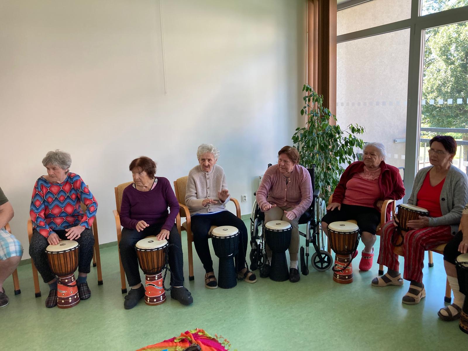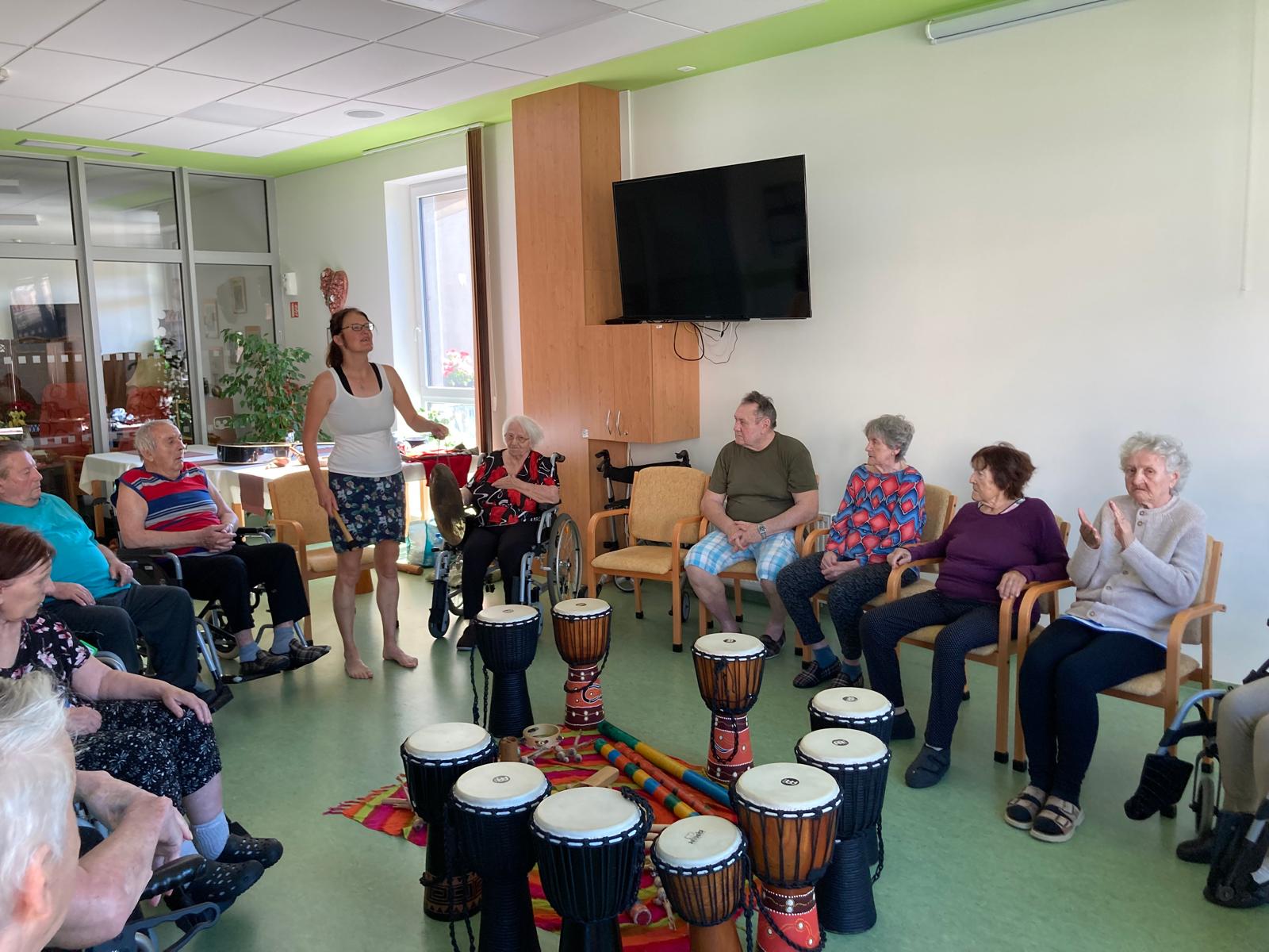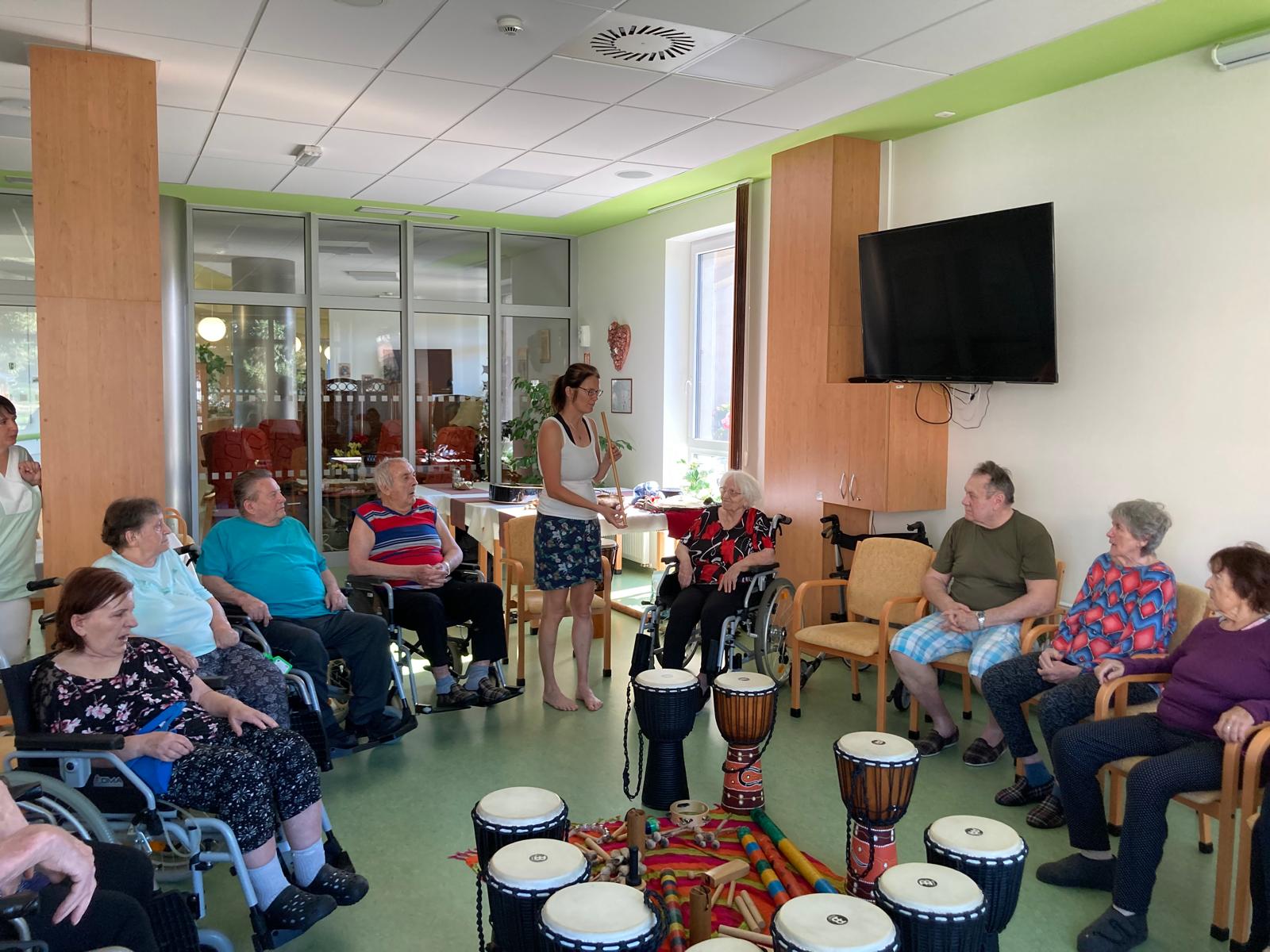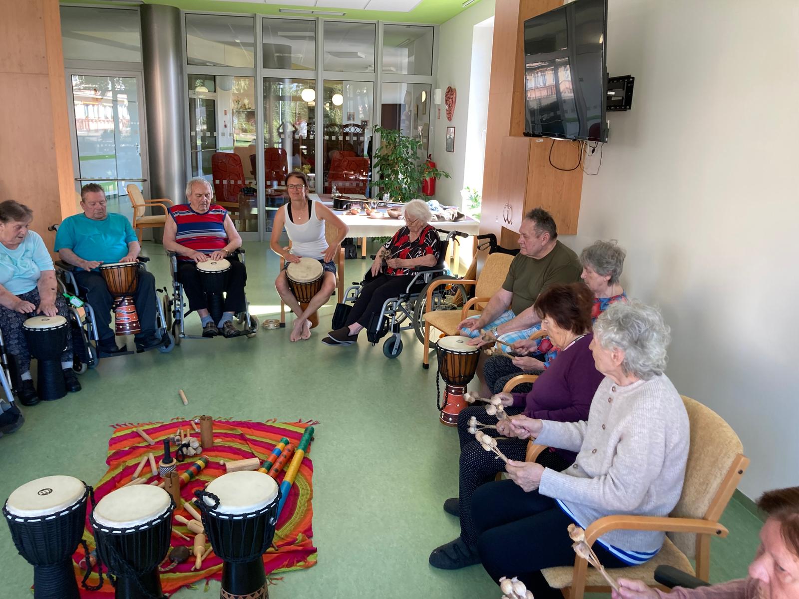 Naši uživatelé se setkali společně ve velké jídelně a měli možnost se aktivně zapojit do hry na netradiční hudební nástroje (např. bubny djembé, dešťové hole, tibetské mísy, koshi zvonky, perkuse). Setkání bylo prokládané pasivními chvilkami, kdy klienti poslouchali melodie zvučných tónů těchto zajímavých hudebních nástrojů.