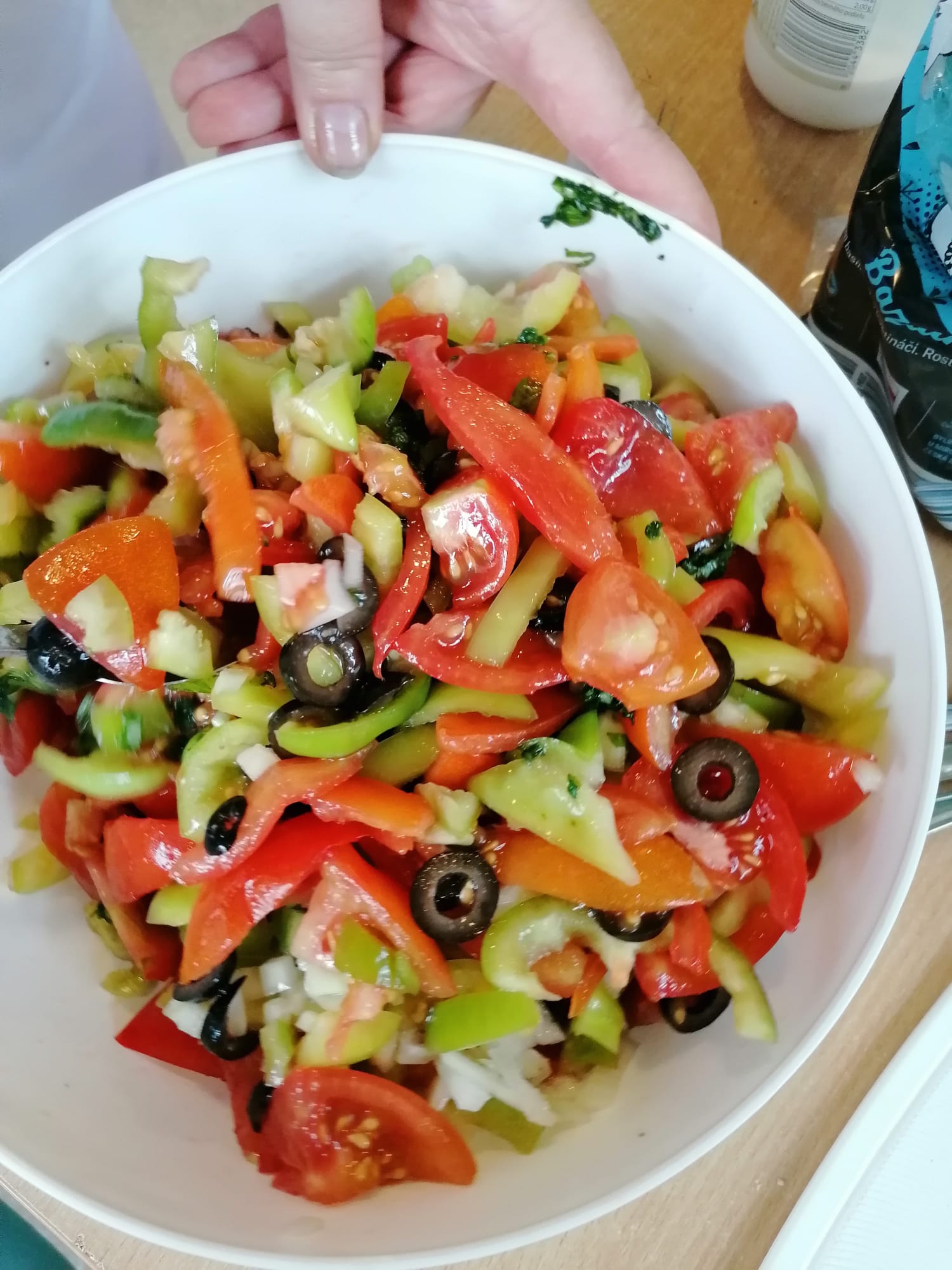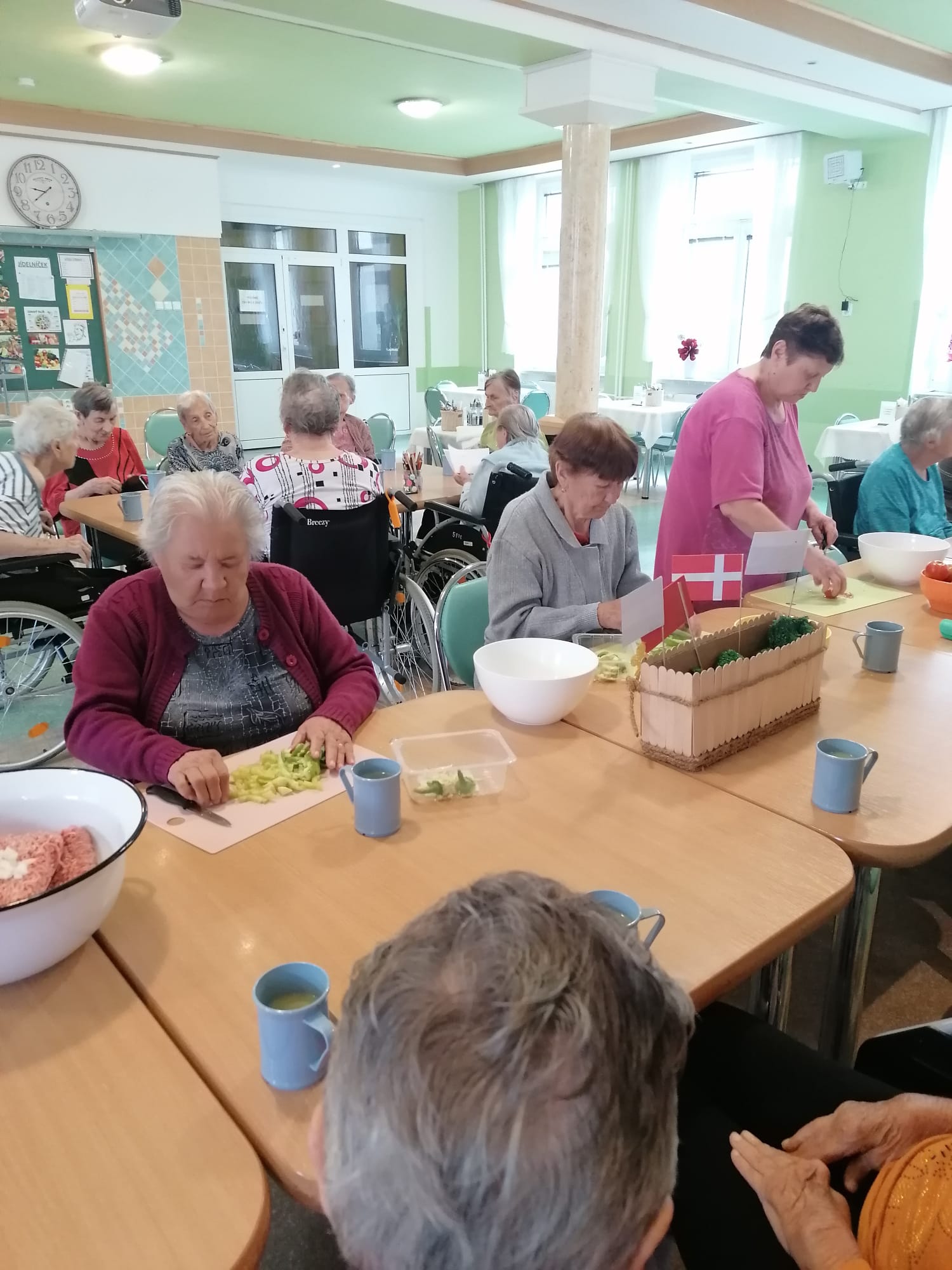 Dnešní úterní dopoledne jsme se podívali pod pokličku do Dánska. Naši klienti začali se zeleninovým salátem s černými olivami a bazalkou. K tomu jsme si opekli bagety na bazalkovém oleji a mleté maso jménem frikadelle. Maso jsme nazdobili olejem s bazalkou zakápli citrónem a ochutnali. Byl to krásný gastronomický zážitek. Chutím zdar.