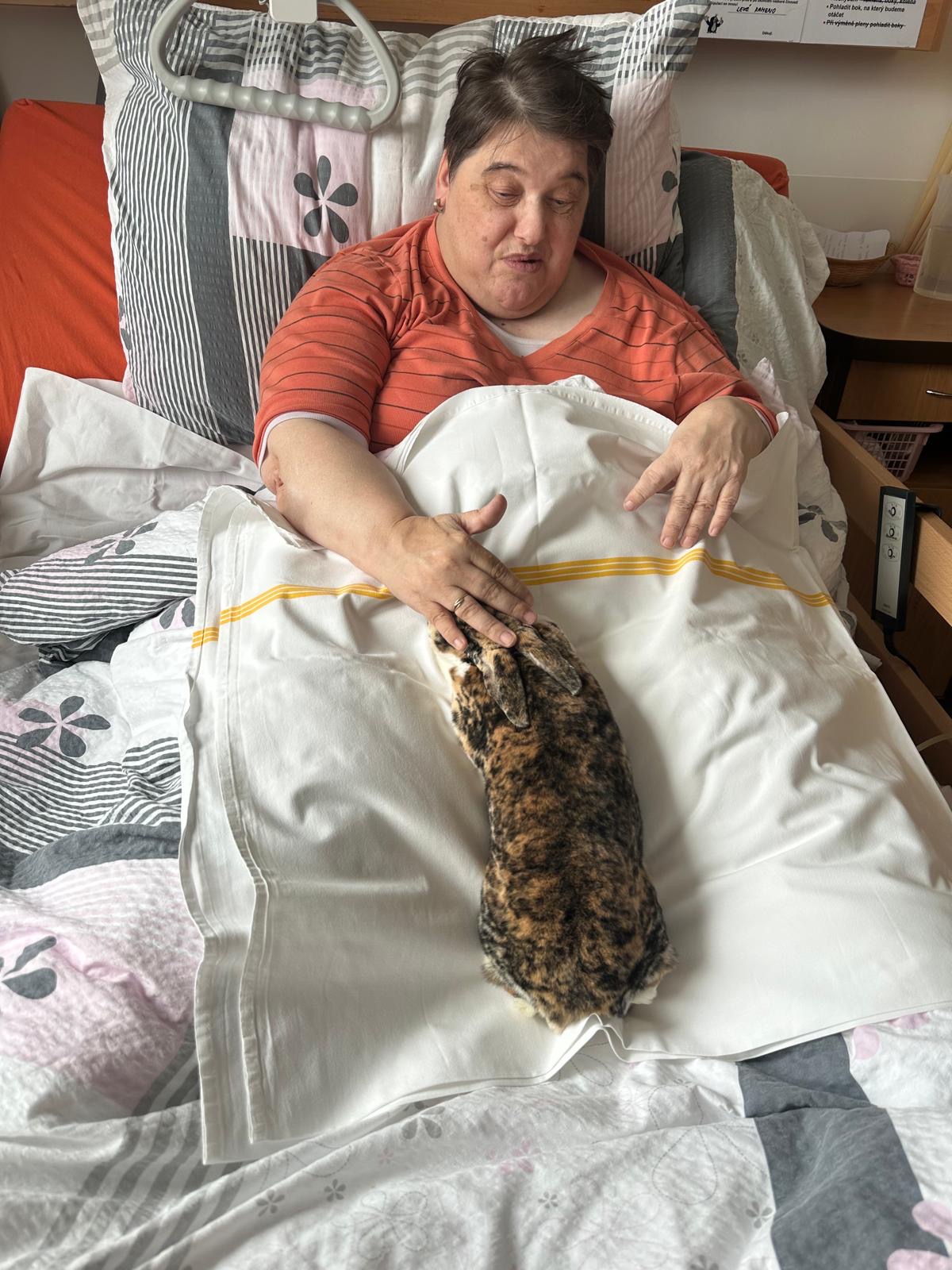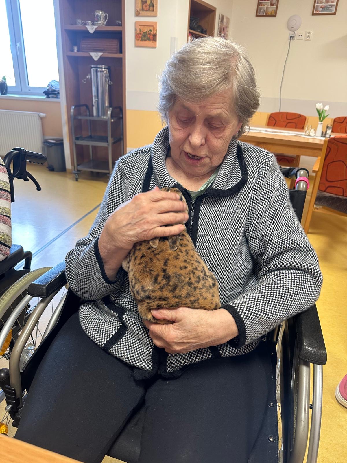 Kuniterapie aneb terapie za přítomnosti králíka. To je léčivá terapie při pocitech smutku, samoty nebo strachu, která využívá schopnosti králíků zmírnit stres a zlepšit náladu. Do našeho domova přijela představit tuto formu terapie paní Barbora Kroupová. Se svými králíčky navštívila klienty na pokojích A pavilonu, takže všichni měli možnost si pochovat a pohladit tato milá stvoření.