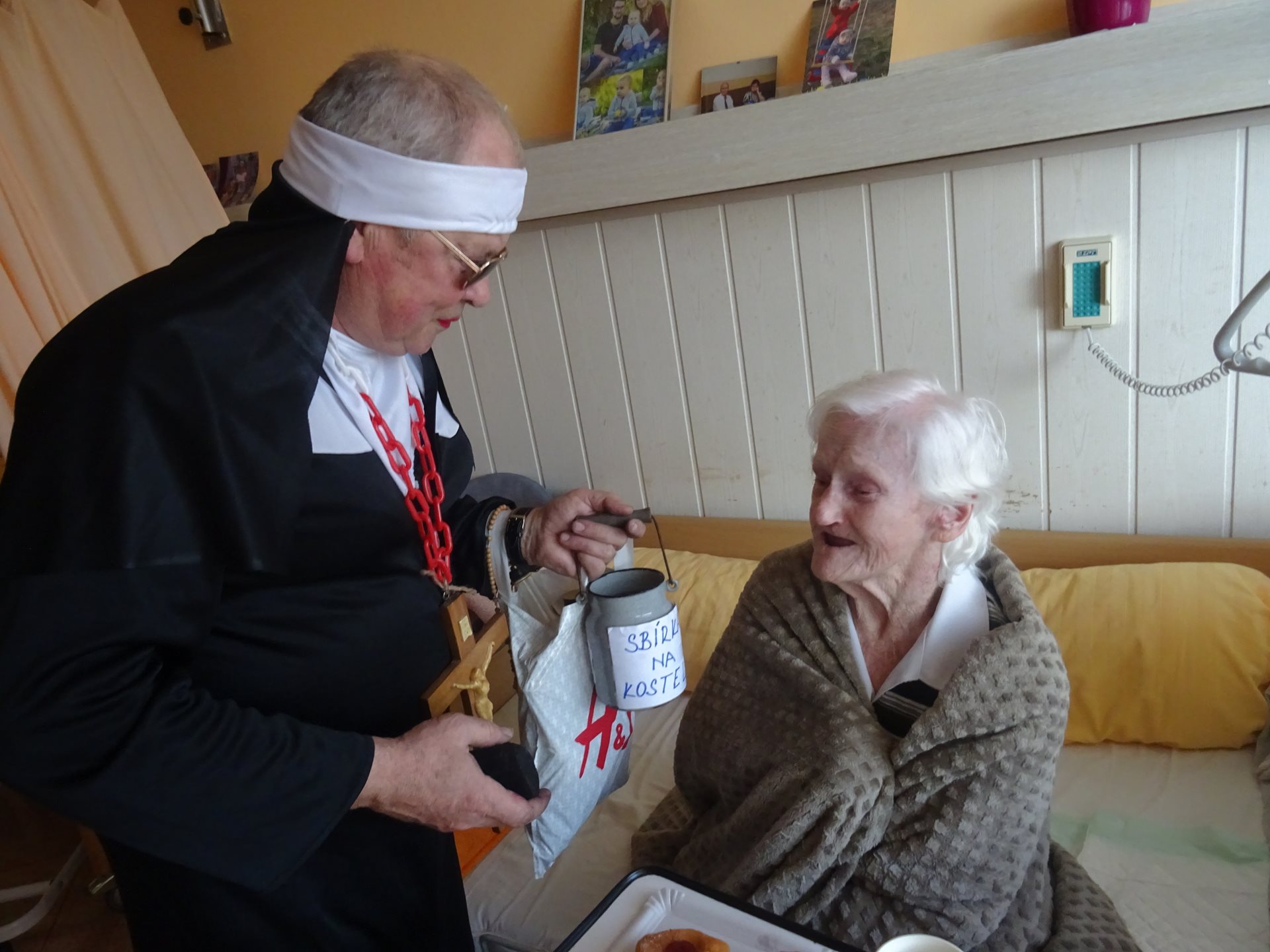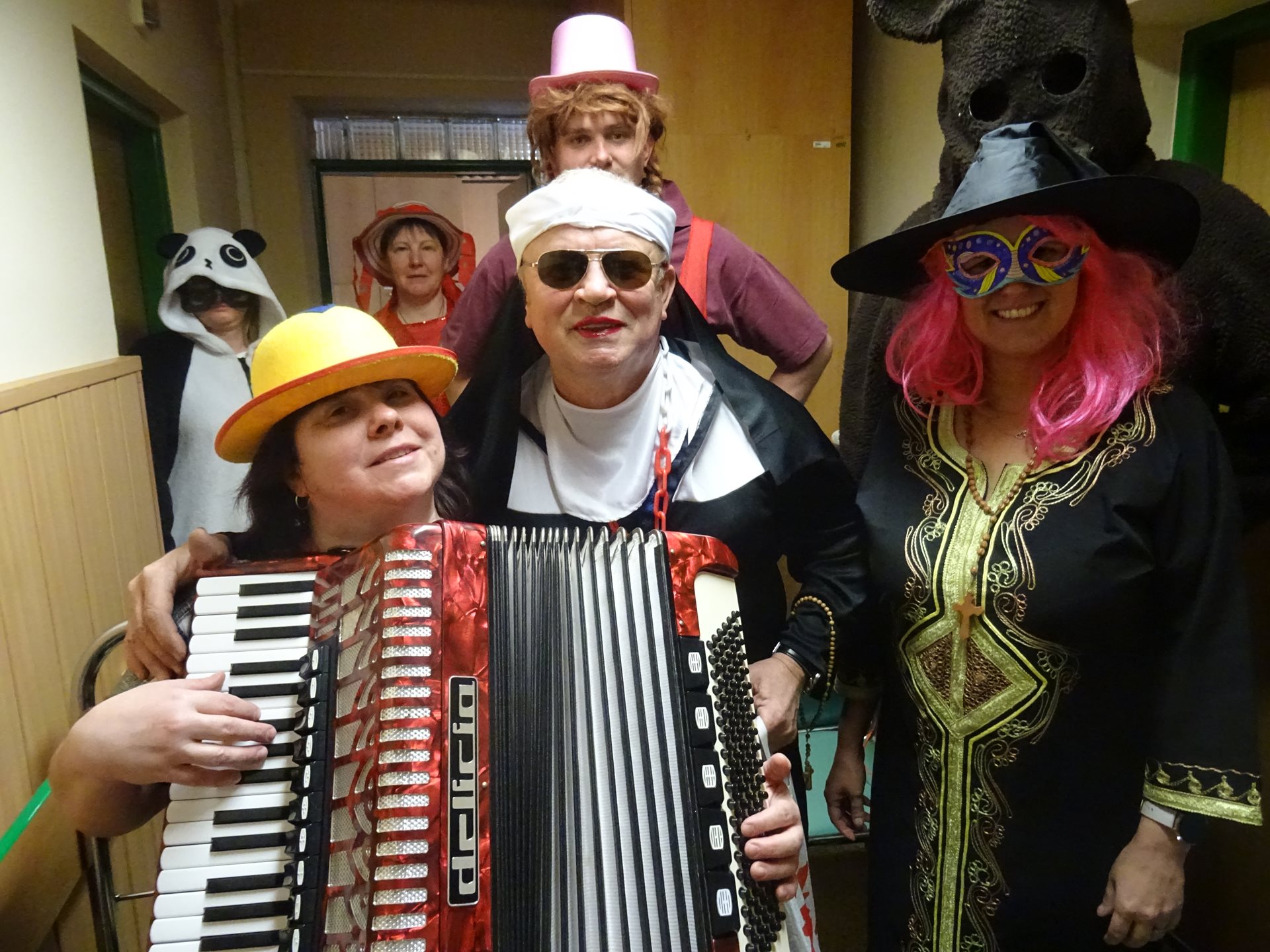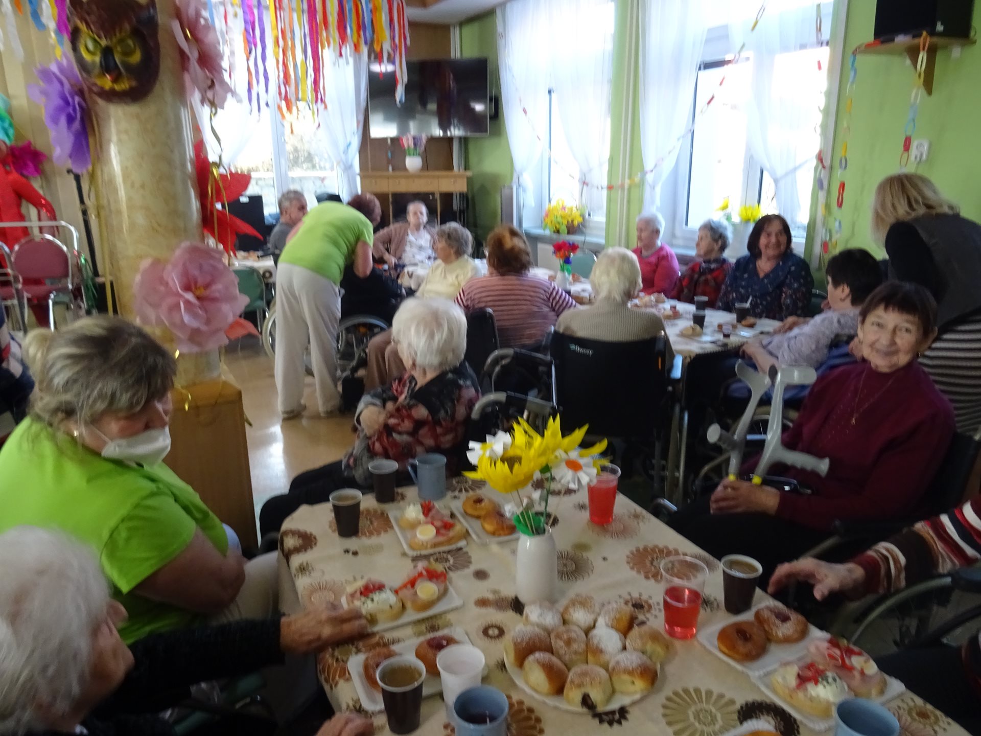 pátek 25. února odpoledne. Skupina masek v čele s urostlým medvědem nejdříve navštívila klienty na pokojích, spolu s koblížky rozdala i trochu veselí a zpěvu pod vedením Elišky Bolckové s harmonikou. Ve velké jídelně pak už na všechny čekalo bohaté občerstvení s kapelou Remix, která hrála k tanci až do podvečerních hodin.