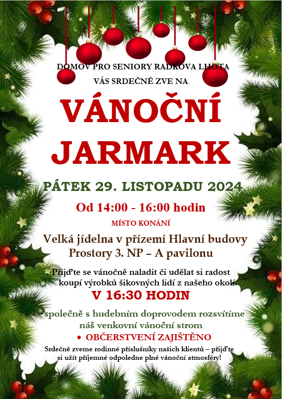Vánoční jarmark se již uskutečnil v našem Domově pro seniory Radkova Lhota ve čtvrtek 29. listopadu 2024. Akce začala ve 13:30 a probíhala na hlavní budově v jídelně a ve 3. patře pavilonu A. Vrcholem programu bylo slavnostní rozsvícení vánočního stromu v 16:30. Všichni si užili sváteční atmosféru, nakoupili drobné dárky a společně přivítali adventní čas.
