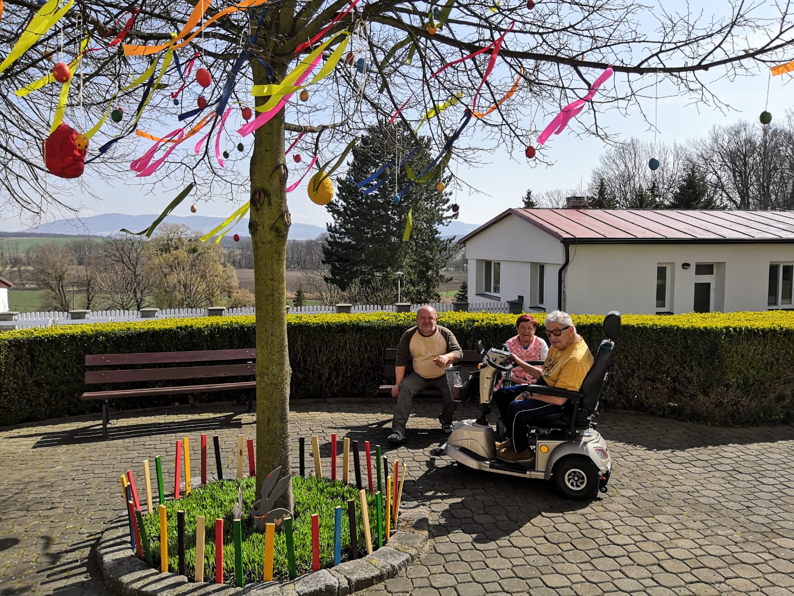 Svátky jara jsou již za námi a naši klienti si plnými doušky vychutnávali nejen teplé počasí, ale především velikonoční výzdobu. Sami nabarvili vajíčka na „ Kraslicovník“, pod kterým trávili čas při odpočinku venku, pestrobarevná kuřátka vesele štěbetali na hlavním schodišti a jejich roztomilost si užívali i imobilní klienti – těm je přinesli na pokoj sestřičky.