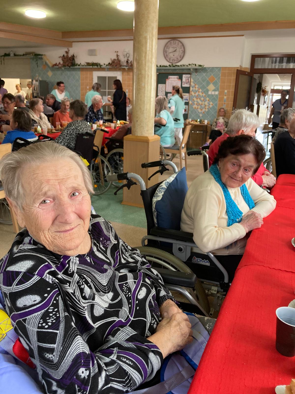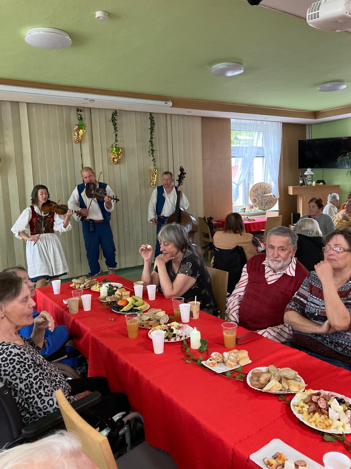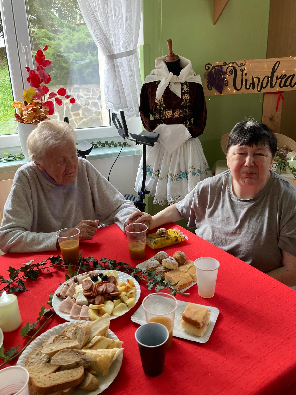 Ve čtvrtek 16. října se v našem Domově uskutečnilo tradiční Vinobraní. Oblíbená akce, na kterou se naši klienti každoročně těší. Čekalo nás příjemné odpoledne plné hudby, dobrého jídla a přátelské atmosféry. O hudební doprovod se tentokrát postarala Hudecká muzika Franty Kopeckého, která nás potěšila známými lidovými melodiemi a navodila tu pravou slavnostní náladu. Nebyla nouze ani o bohaté občerstvení, dobré víno a podzimní dobroty, které k vinobraní neodmyslitelně patří.