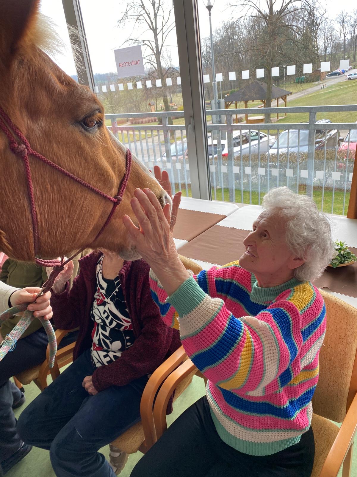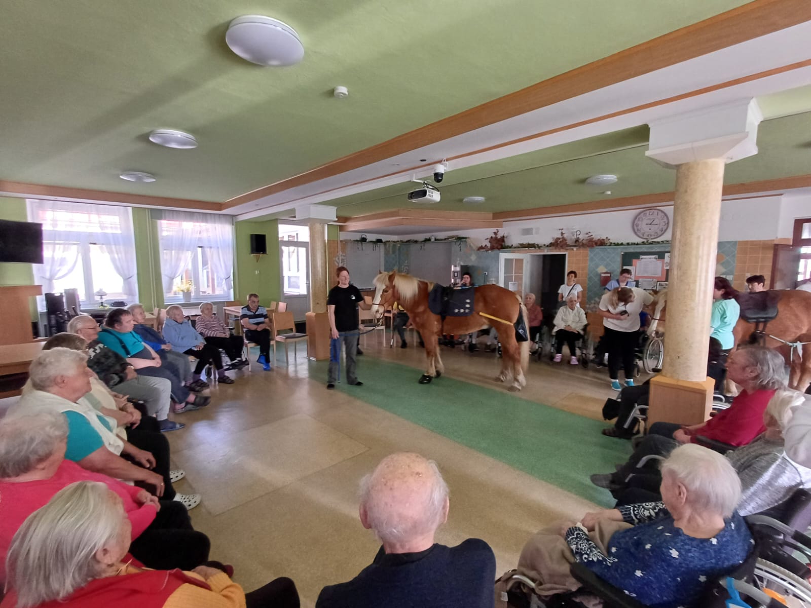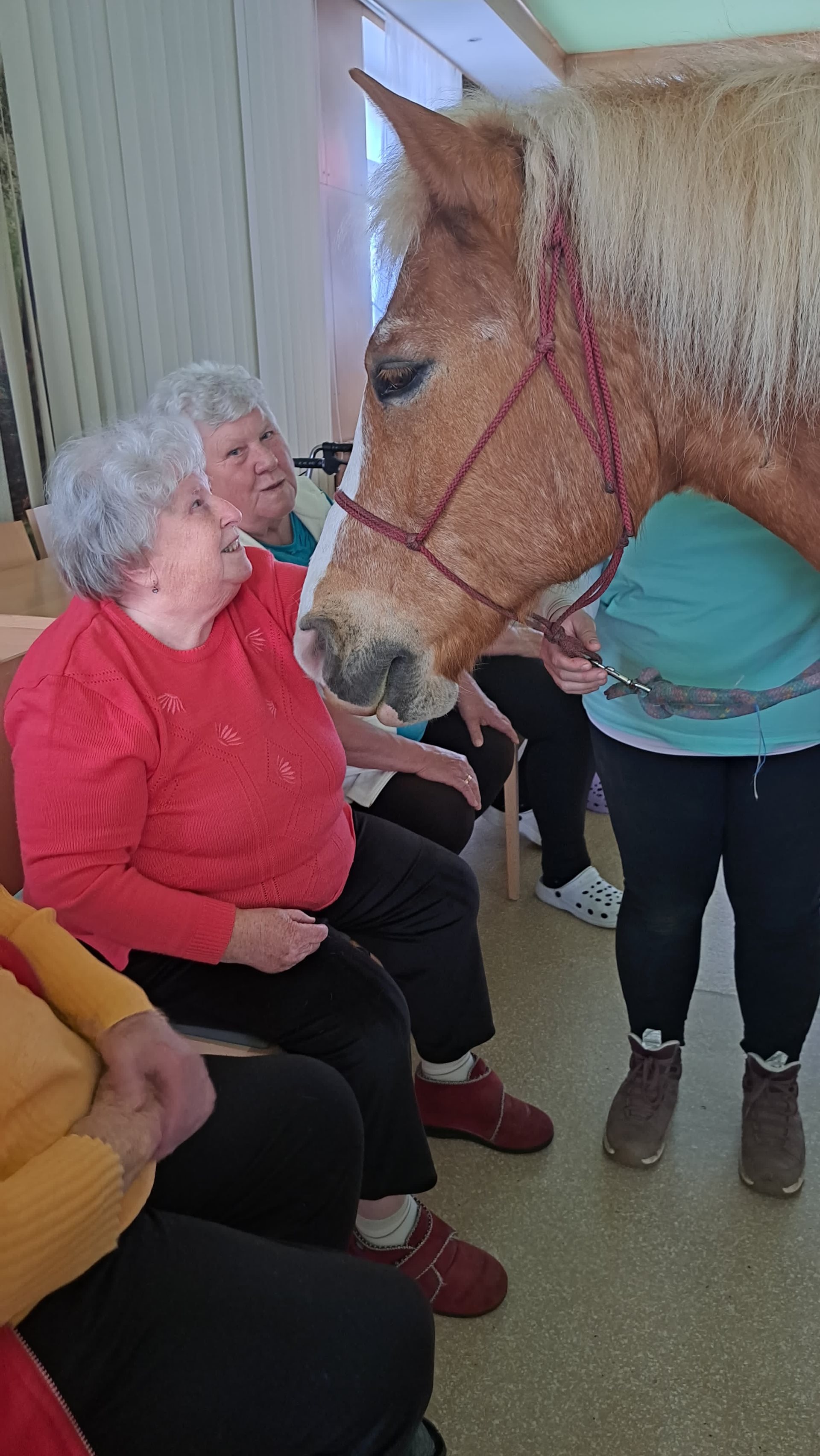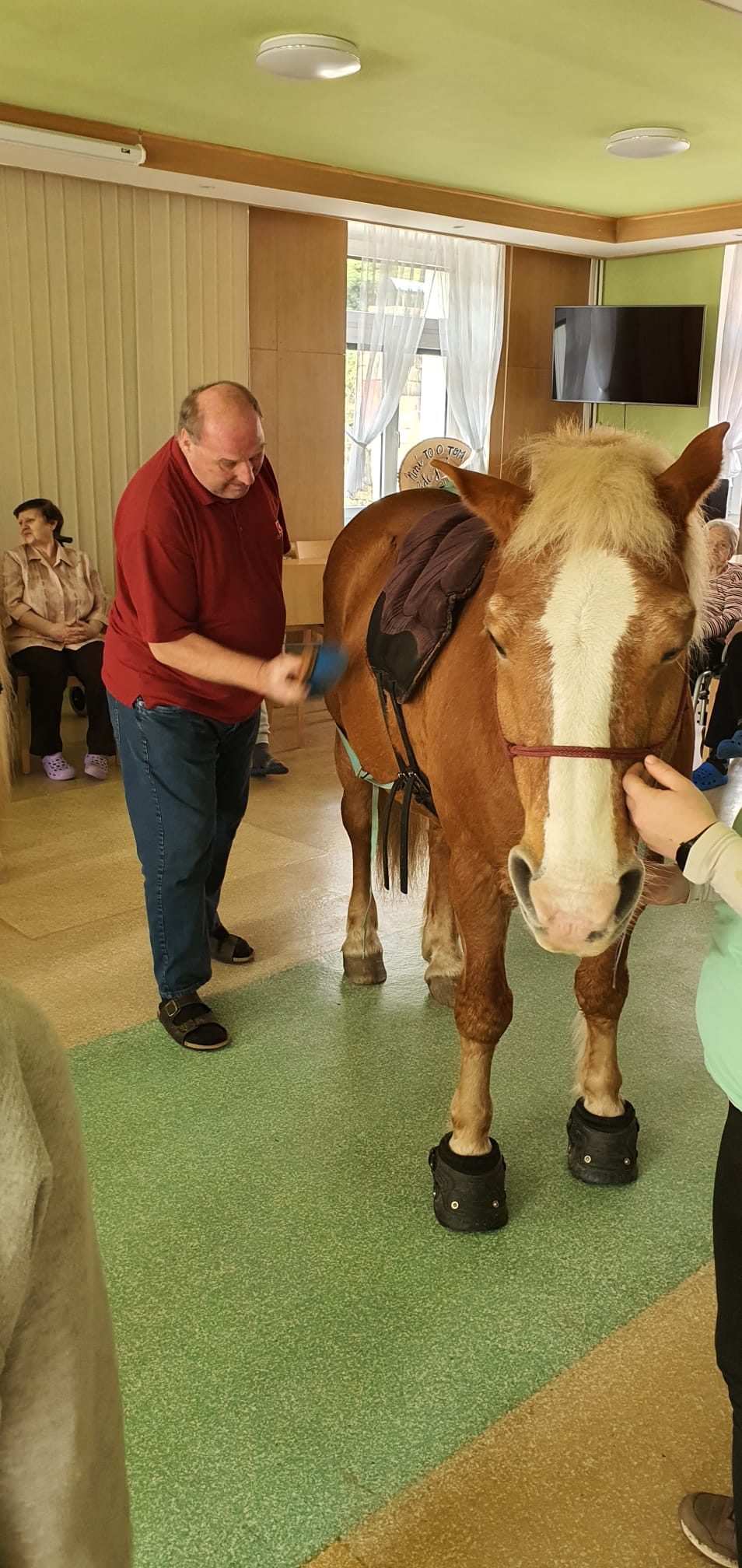 Neskutečným zážitkem pro náš domov byla premiérová návštěva koní z jezdeckého klubu Portáš. Zooterapie se u nás činí velké oblibě, proto i návštěva koní sklidila obrovský úspěch. V průběhu setkání si mohli klienti koně pohladit, tiše s nimi promlouvat, nebo je i vyčesat. Za těmi, kteří neměli možnost se společné návštěvy zúčastnit, dorazila zvířata dokonce přímo na pokoj a každému klientovi trpělivě věnovala svůj čas. Bylo vidět, že návštěva přinesla spoustu radosti a pozitivní energie. Věříme proto, že setkání nebylo poslední a budeme se těšit na brzkou shledanou.